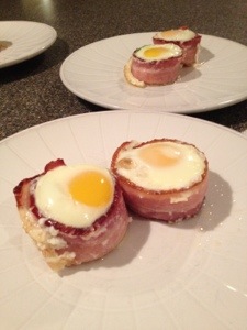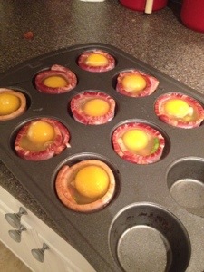 Using a muffin pan grease each cup with a drop of coconut oil. Then wrap a slice of bacon inside each muffin cup. Variety of veggies can be used, this morning I used diced tomatoes and green onions. Simply sprinkle your veggies in the bottom of the bacon circle, then carefully crack and egg on top of each muffin.