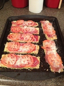 When zucchini is done pull out and place a slice if prosciutto on each zucchini then layer thin sliced onions and tomatoes. Sprinkle each slice with a little Parmesan cheese.