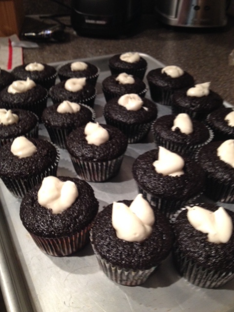 Heat a pot of water to boiling then put white chocolate chips in a bowl and sit over bowling water, add a couple tablespoons of milk and continue to stir. Remove from heat when 75% of the white chocolate has melted, then stir until creamy. Add to frosting bag with small tip, and pipe decoration onto cupcakes. I wrote ‘kakes’ but feel free to be creative, traditional would be 7 small swirls connected.