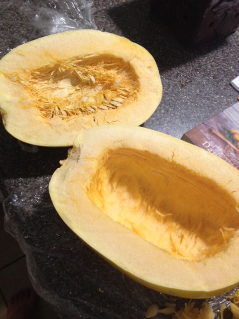 Step 7: Let cool for a minute, or do as i do…use the oven mit to awkwardly hold the very hot squash while using my fork to scoop out the insides. The fork is essential, you want to ‘brush’ out the insides with the fork to form the ‘noodles’.