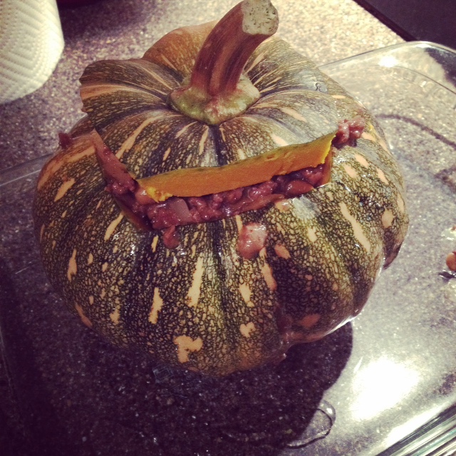 Wash pumpkin, cut the top off, clean out the guts. Spoon the beef mixture into the pumpkin, replace the top. Place in a greased baking pan, rub additional oil over the outside of the pumpkin. Bake uncovered at 350 degrees for 1 to 1 1/2 hours or until the pumpkin is tender. Scoop out some pumpkin with each serving of meat.