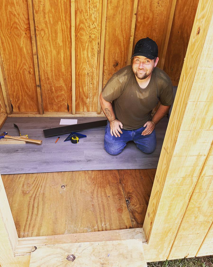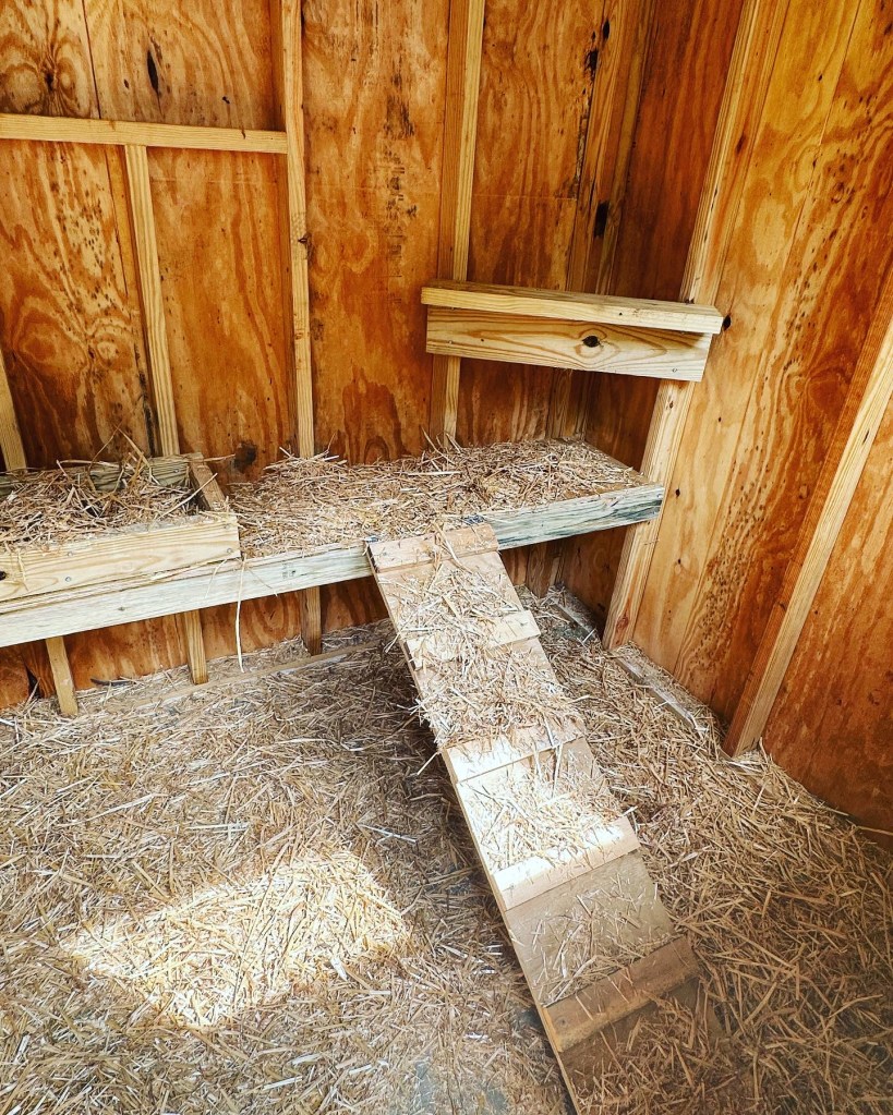 Once the siding was on, and the roof on, Tyrel did some custom work on the inside. We purchased some inexpensive waterproof vinyl flooring to help prevent the plywood floors from being destroyed by Guinea poop (which did you know Guineas poop sooo much!). He also built some nesting boxes, just in case they want to lay eggs for us to try, and some roosting areas. We will also be adding a few branches inside as well since they all fight over the one higher perch. They also have a solar-powered light to help them find their way home in the evenings.