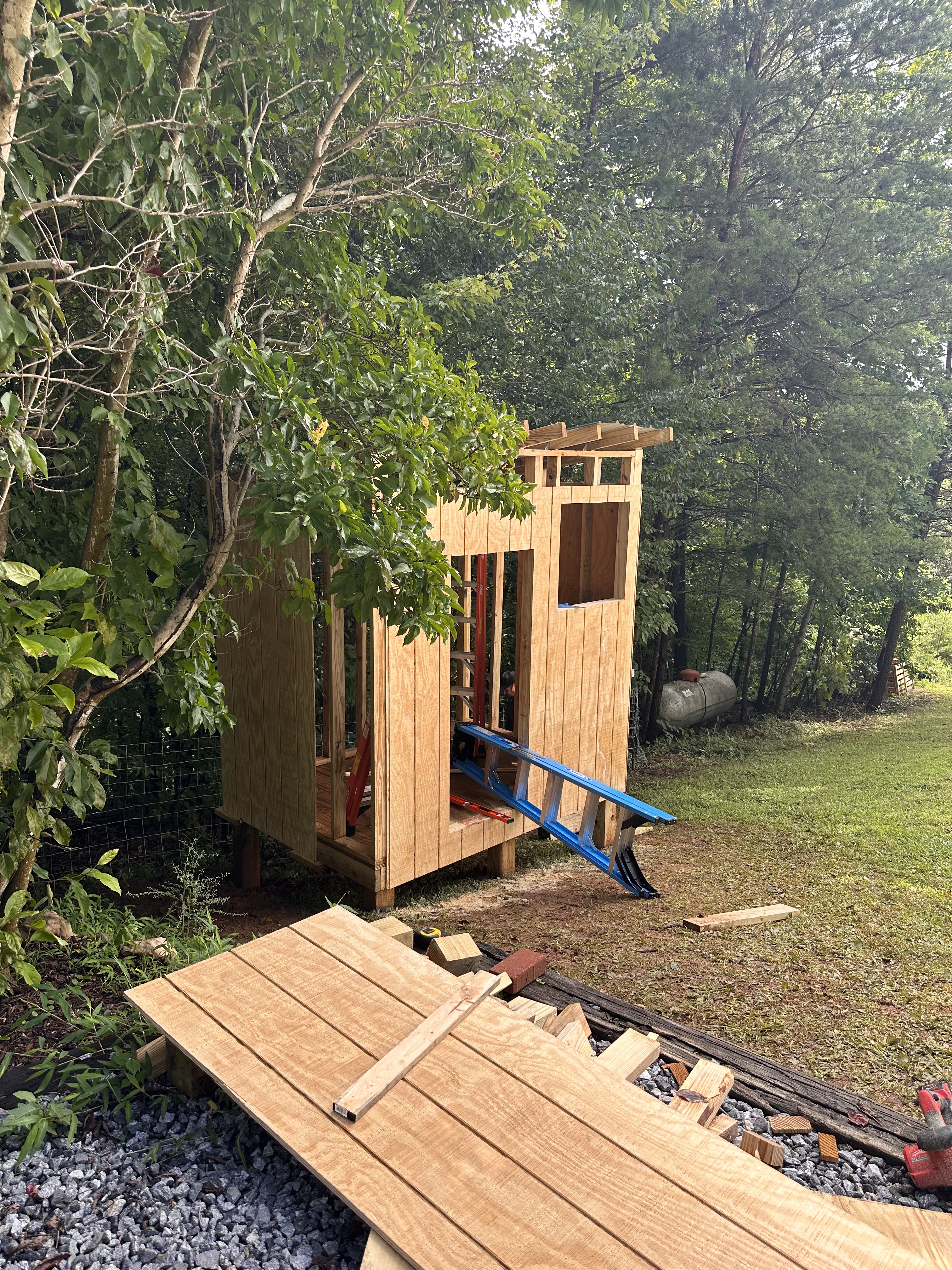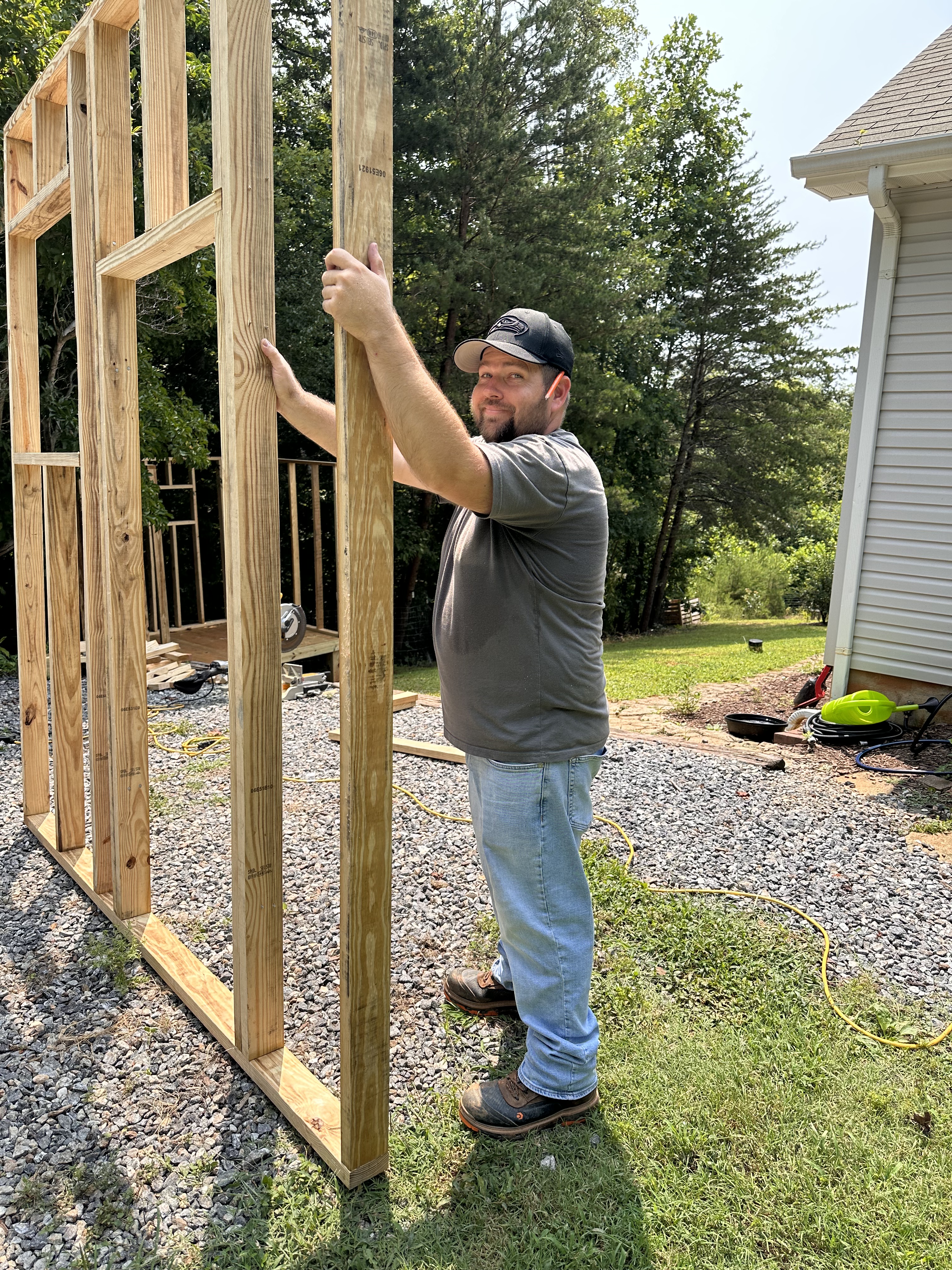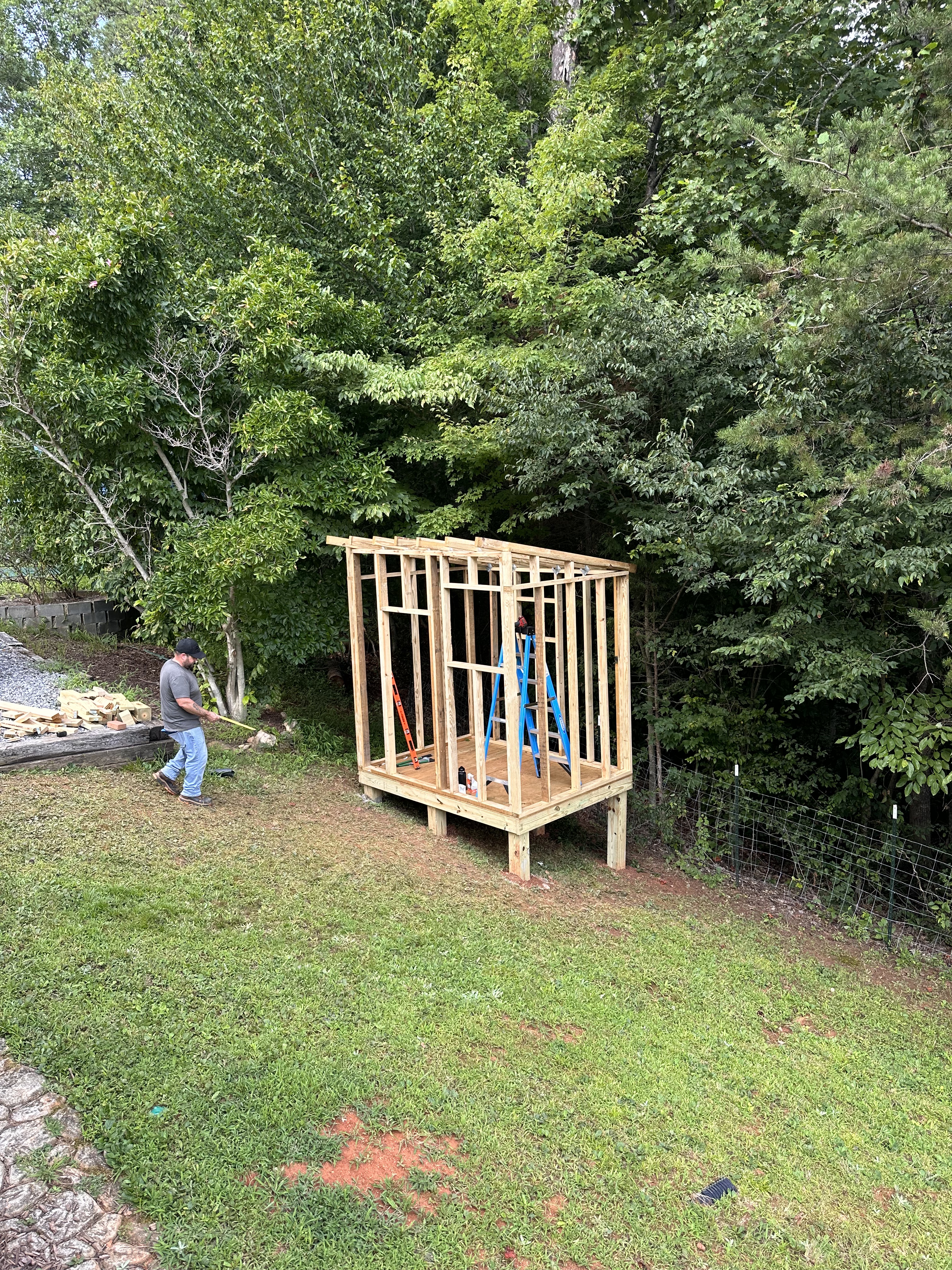 Once we realized that we, in fact, did not live in a vortex house and that the slope was just playing tricks on our eyes, we were able to get to work on finishing the floor. Our first walls were pretty easy to stand as well. We wanted to build this structure to last, so we followed the rules for building homes. Plus, if this doesn’t work out for the Guineas, our youngest can move in here when he needs space.