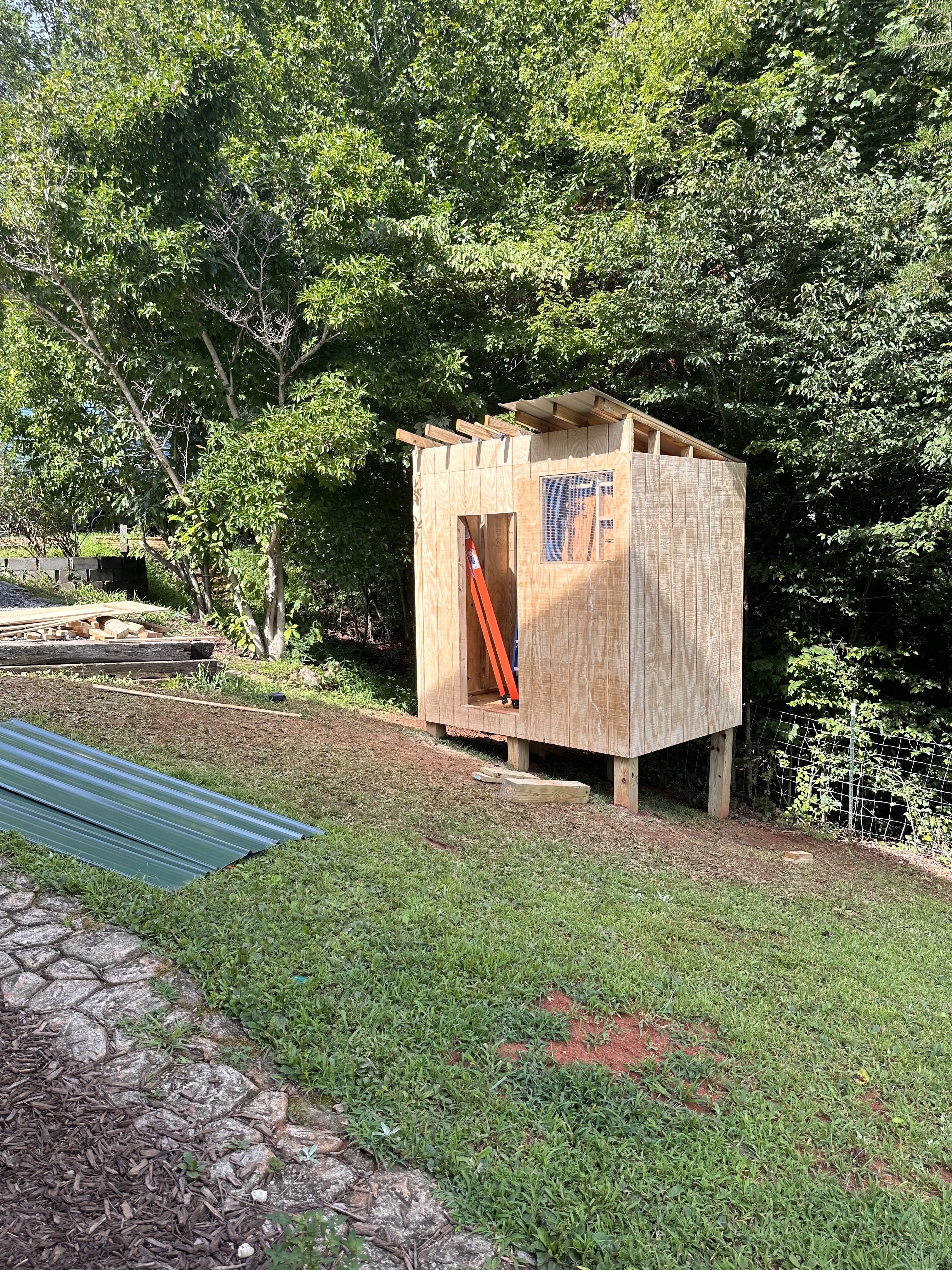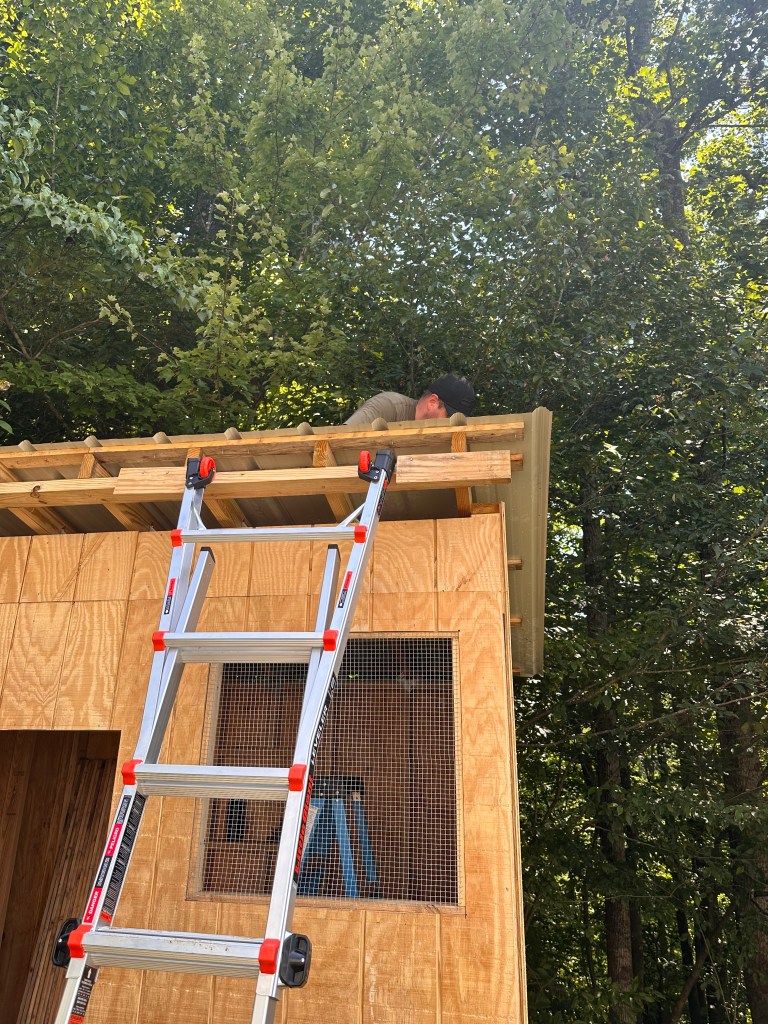 Once the walls were standing and things were starting to feel a little more sturdy and like an actual structure, it was time to put on the roof and siding. Things got a little sketchy since this building is about 9 feet tall and a couple feet off the ground at the steepest part of the slope, and Tyrel had to go on the top to secure the metal roof. Deep breaths, hoping he didn’t slide off the back and impale himself on the fence posts behind the Guinea coop. I am pleased to report that he safely secured the roof to the Guinea coop without incident.