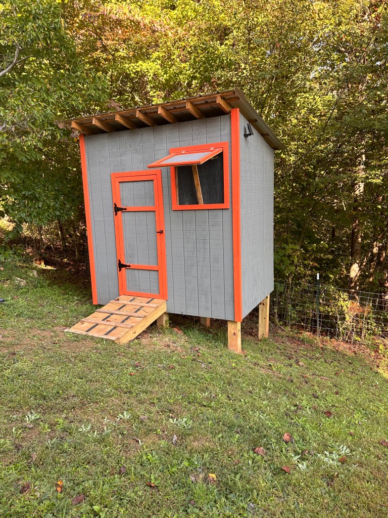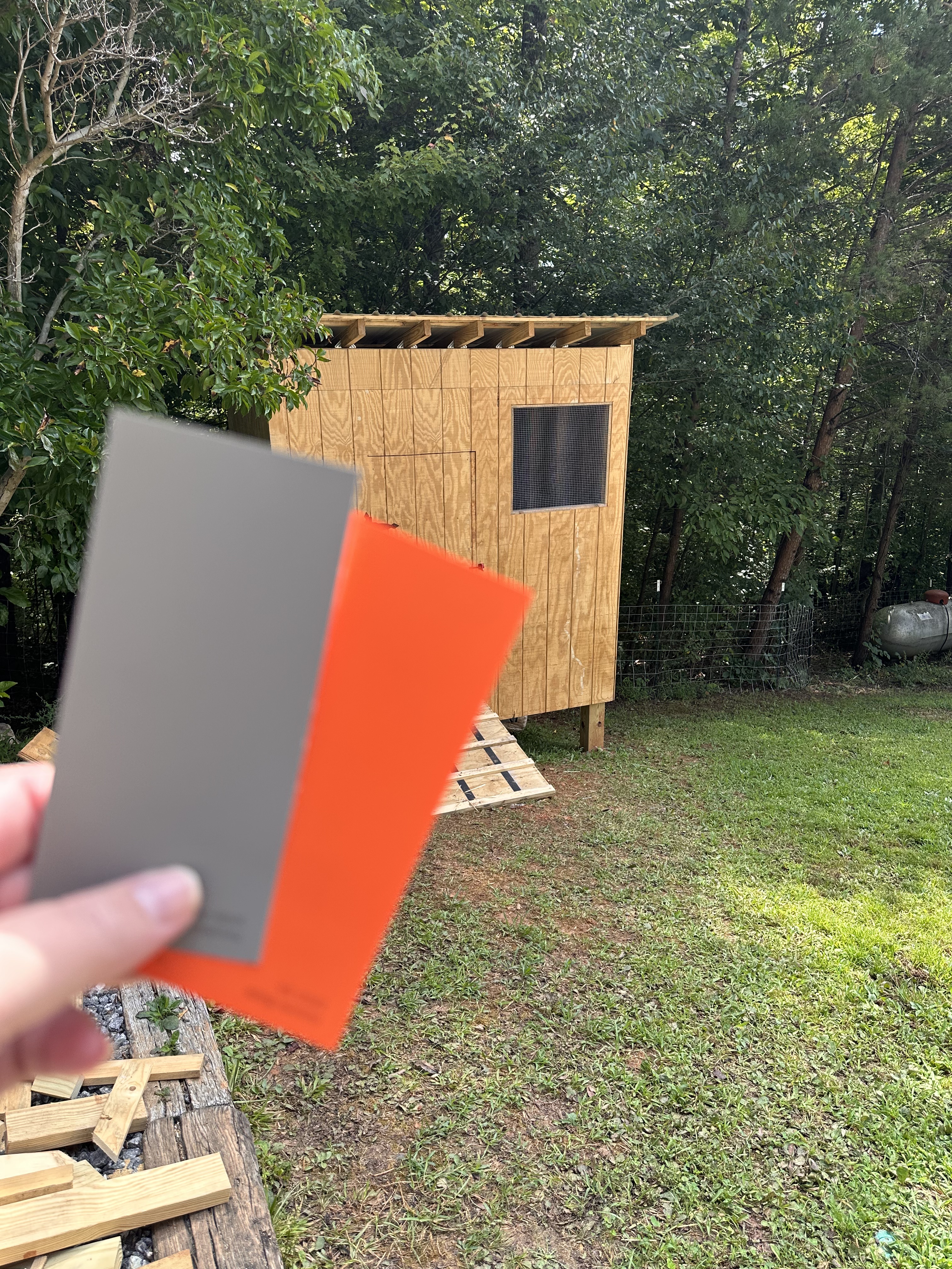 I knew that I wanted orange and gray, so I walked over to the paint selection without thinking that Tyrel would agree. Since the coop sits outside my office window, and I work from home, Tyrel decided that I could paint it any color, so after much deliberation over the vast collection of Orange and Grey paint swatches, we found our selection!